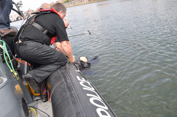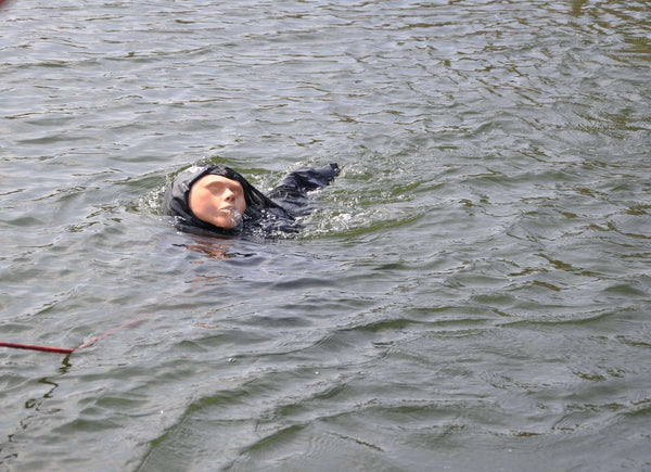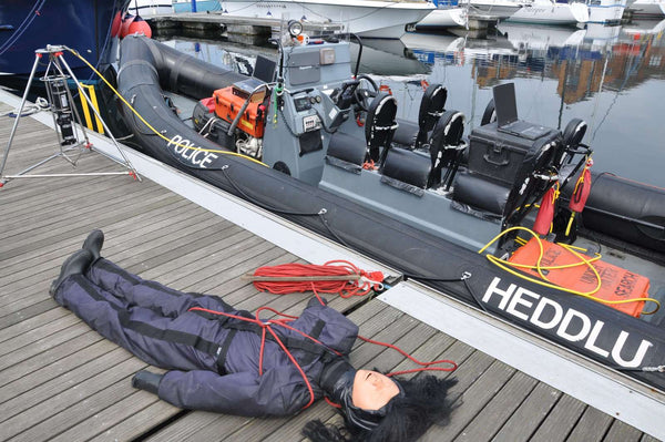A pre-established protocol is essential for victim retrieval - the body recovery manikin was predominately designed to aid Police dive teams train to recover bodies from any inland waters or under ice. The manikin is a variant of the popular Water Rescue manikin - but instead of floating, it sinks. By balancing the buoyancy against the ballast the manikin weighs 50kg on land but only 10kg under water, similar to a real human. The body recovery models are visible to sonar devices - the gallery image was taken using a Cmax CM2 Side Scan and Konsberg Sector Scan Sona.